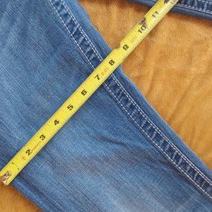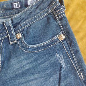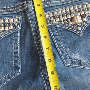 Size 28 w 33in inseam bootcut Denim Jeans made by the all popular Miss Me Brand. All stones, tabs & Miss Me Buttons still remain on jeans. These are barely worn jeans w alot of wear left & the color of denim is new & stylish. Seams on legs are straight as they should be.