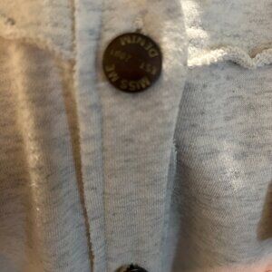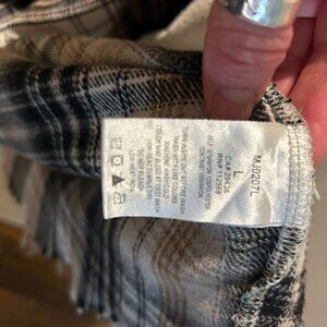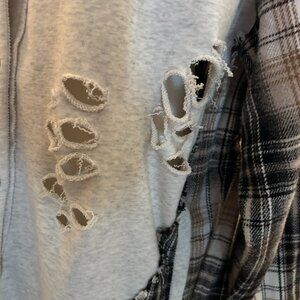 This shabby Chic, distressed, destructed shacket is oerfect for layering or wearing on its own. Versatile Oatmeal color and a neutral black and tan flannel goes great with Jeans. EUC