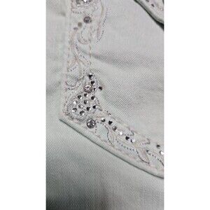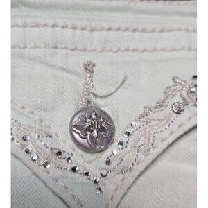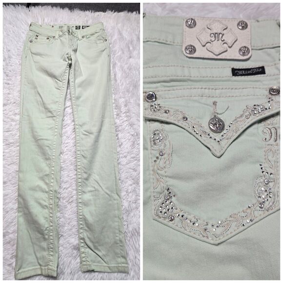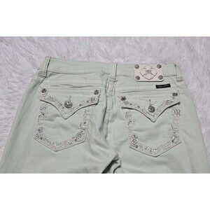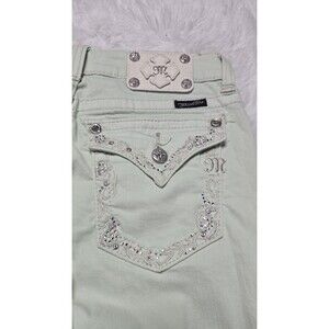 The Miss Me Lime Green Embellished Skinny Jeans in size 30x32 are a stylish and trendy addition to any woman's wardrobe. These mid-rise jeans feature a slim fit with a 5-pocket design and full-length inseam, making them perfect for the summer, fall, and spring seasons. The embellishments of rhinestones and embroidery add a touch of flair to the solid green color, while the cotton blend fabric ensures comfort and stretch. Easy to care for, these jeans are machine washable and a great choice for everyday wear.