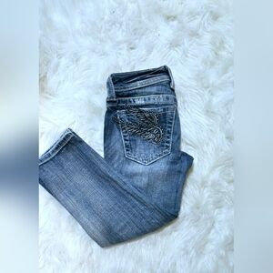 Miss Me low rise capri jeans with rhinestone angel wings on back pockets. Size 24