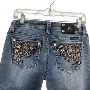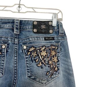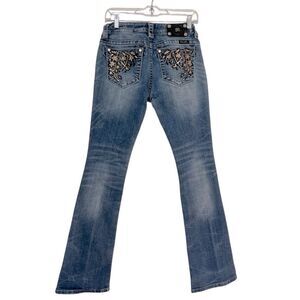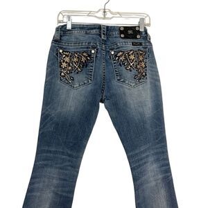 Miss Me Low Rise Signature Boot Cut Jeans Floral Rhinestone Pockets Medium Wash
