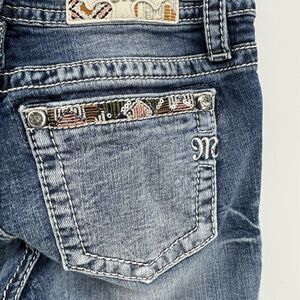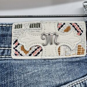 The Miss Me Mid Rise Capri Womens Size 25 Distressed & Bejeweled Beaded Jeans are a stylish and edgy addition to any woman's wardrobe. These jeans feature a mid-rise fit and a 5-pocket design, with the added accents of distressed detailing and beaded embellishments. The denim fabric is medium wash with a solid blue color, perfect for the summer, fall, and spring seasons. Made by the brand Miss Me, these jeans offer a regular fit and are machine washable for easy care. Ideal for those looking for a rock, cowboy, or Southwestern-inspired look.