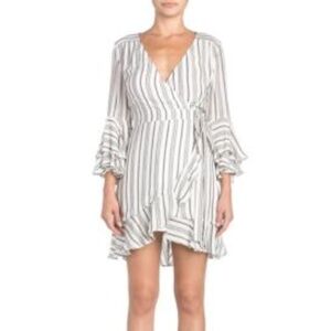Ruffled details spice up the feminine style of this wrap dress by Miss Me, while the earthy stripes lend a relaxed feel.