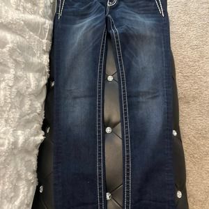 Miss Me dark denim blue jeans with white stitching and Swarovski crystals on pocket. Never worn excellent condition. Size 28, inseam measures 29.5” from top to bottom is 39”.