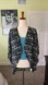 Measures 32 inches pit to pit and 29 inches shoulder to hem. This cardigan features a black and white Aztec-style print and an open-front design, similar to a kimono or cover- has beading on both shoulders and a dolman sleeve. Will also fit a size medium