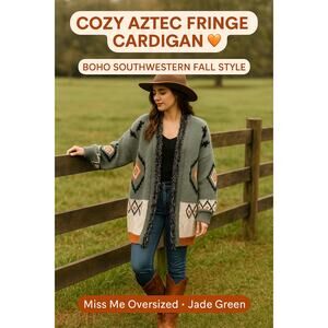 Cuddle up in this Miss Me oversized Aztec fringe cardigan 🧡 Cozy jade green knit with boho southwestern patterns, open front, and soft fringe trim. Perfect for fall layering, cozy coffee runs, or winter festival style.