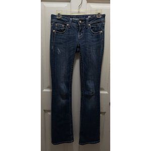 miss me sz 25 bootcut medium dark distressed blue denim nice peace sign with crystal jewel Jim Nice metal hardware.