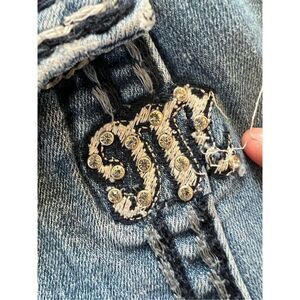 Boot cut jeans from Miss Me. Ripped and distressed fabric and hems. Whiskering and fading, zip fly, classic 5 pocket styling, and Miss Me signature logo patch on back waistband. Buttoned flap back pocket. Miss Me "M" logo is embroidered on the back left pocket and embellished with rhinestones. Starting to unravel a bit, but still ok. Please see photo for close up reference.