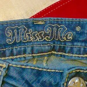 NWOT Miss Me Signature Boot Jeans Bling Wings Pockets Design, Super Stretch, Silver Label Miss Me Metal Logo Color M543 Style J3252BR Size 28/31