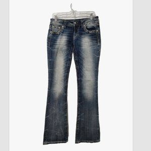 Miss Me JEANS Signature Boot style no: JY7037B. Miss Me Signature Boot Jeans Women's size 28 on tag Bootcut Stretch Denim 29 x 32 actual. Miss Me Women's Signature Boot Cut Jeans Denim Stone Wash Embellished Low Rise