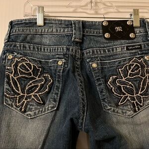 Miss Me Signature Rise Boot Blue Jeans 28 Med Wash Rhinestones Embroidered Rose