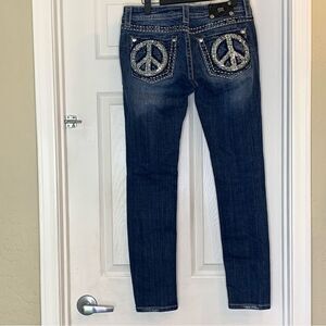 Miss Me Signature Rise Bootcut Jeans, Embroidered Sequined Peace Signs Size 28