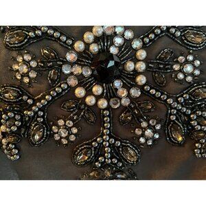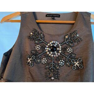 Miss Me Babydoll Bubble Mini Dress, size Medium. This is a beautiful grey-brown silk blend baby-doll dress with beadwork of faux jewels and pearls shaped like an icicle. The dress is sleeveless with a scoop neck, fitted in the bust and empire waist. The skirt's hem is folded back to create a "Bubble" look at the hemline. The color is a pretty earth-tone brown leaning on the grey side.