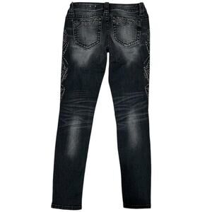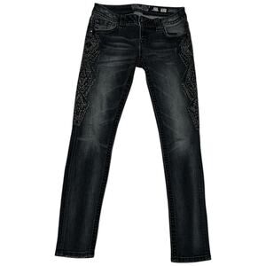 Miss Me skinny jeans with silver tribal embroidered thighs. Black and grey tone denim. Perfect condition.