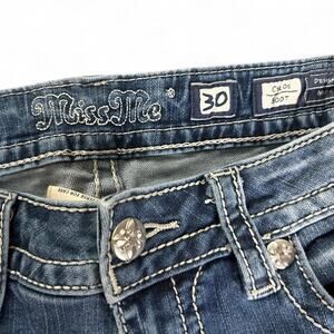 Elevate your denim game with these stunning Miss Me Chloe bootcut jeans featuring beautiful sunflower embroidered back pockets. These size 30 blue jeans combine classic bootcut styling with signature Miss Me embellishments for a look that's both timeless and eye-catching.