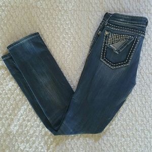 Size 29 Regular skinny jeans. Inseam 31- Bold white stitching on all seams and rhinestones on back pockets. Dark to medium wash.