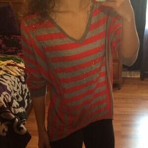 Miss Me 3/4 sleeved shirt. Red and gray striped. V-neck with Chevron-patterned gems on the front. Size Small.
