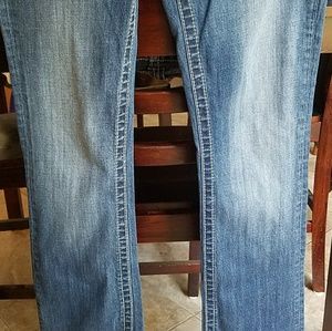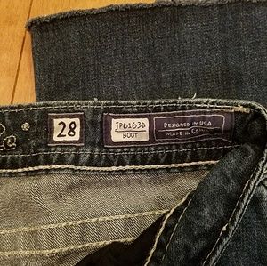 JP6163B boot cut, classic thick white stitching, whiskering on legs. Snakeskin, metal & crystal embellishments create the Fleur De Lis on flat back pockets. Length 35, inseam 27. Jeans were cut & left with a raw fringe look (see pics) The last pic posted is more true to the actual color of jeans.