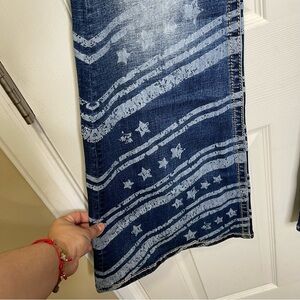 High-rise, dark wash flare jeans with contrast stitching, printed stars and stripes on leg and a 5 pocket design with rhinestone rivets.