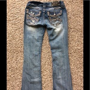 Excellent condition. Rhinestone embellished back pockets. Destroyed front medium wash. Button/zip fly. 31 inch inseam.