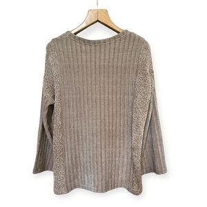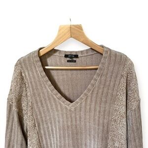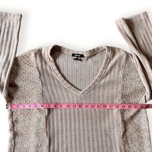 Women’s size small v-neck sweater by Miss Me. Taupe with a hint of dusty rose with contrasting textures. Super soft chenille fabric made of polyester. Oversized fit with wider sleeves. In great pre-owned condition with no flaws.