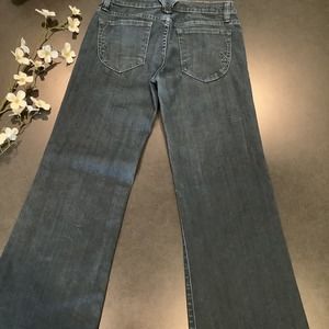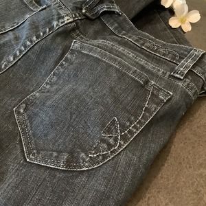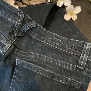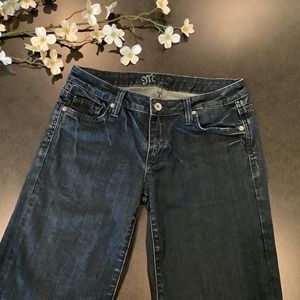 VGUC Miss Me jeans, size 29. Style #JP4531. Five pockets, zip fly. Wide leg flare, low rise silhouette. Dark wash with crackle pattern fading and pretty blue embroidery stitching on fly, belt loops and back pockets. 98% cotton and 2% elastin, moderate stretch. Long snag/scratch on right front leg, see photos. Approximate measurements laid flat: