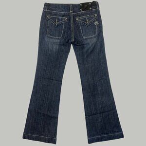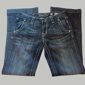 These Miss Me bootcut jeans offer a classic silhouette with their dark wash and stylish stitching. Crafted for comfort, they suit casual outings.