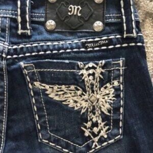 Miss Me Wing Cross Capri Jeans Stonewood Dark Wash Embellished White Top Stitch