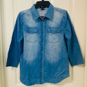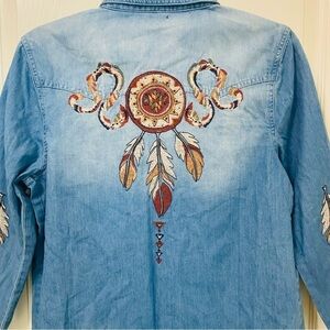 Miss Me Womens Embroidered Fringe Denim Chambray Western Button Down Top Size S