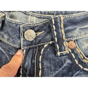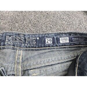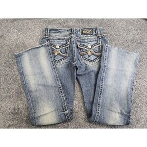 The Miss Me Women's Irene Bootcut Embroidered Jeans in size 29 are a stylish and versatile addition to any woman's wardrobe. Featuring a low rise and bootcut style, these jeans are perfectly designed for a flattering fit. The denim fabric is accented with rhinestone and embroidered detailing, adding a touch of glamour to the classic design. With a 5-pocket design and distressed detailing, these jeans are perfect for any season and can be easily machine washed for convenience. Made with a blend of spandex and cotton, these jeans offer a comfortable and stylish option for everyday wear.