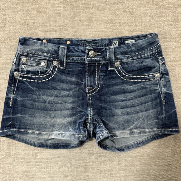 The Miss Me Women's Mid-Rise Easy Shorts in denim with thick stitch and rhinestone studs in size 26 are a stylish and versatile addition to any woman's wardrobe. These mid-rise hot pants feature a comfortable and stretchy fabric with a 5-pocket design for added convenience. The solid blue color and Western theme make them perfect for casual occasions in any season. Easy to care for with machine washable instructions, these shorts are a trendy choice for a variety of activities and looks.