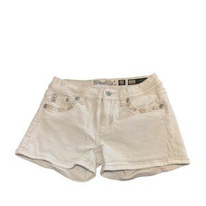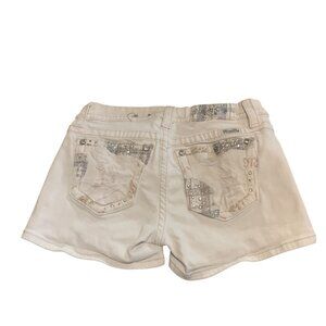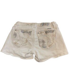 These Miss Me shorts offer a stylish and polished look with intricate rhinestone details and durable white denim. A versatile choice for warm-weather attire.