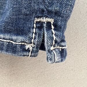 Miss Me Women’s Signature Capri Jeans. Tagged size 27 (4). Blue in color with a medium denim wash. Embroidered and embellished back pockets with a scalloped design, rhinestones, and leather. These low rise jeans have button flap back pockets and are in good preowned condition. Made of 98% cotton and 2% spandex for stretch and comfort. Classic black leather logo tag on the back waistband.