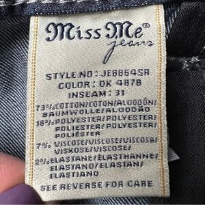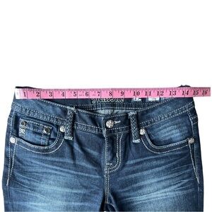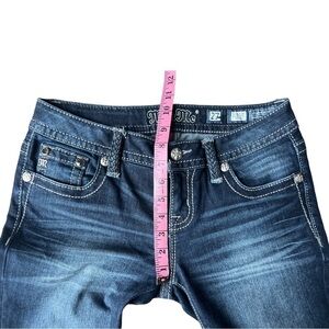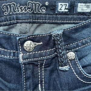 Women’s size 27 dark wash Signature Skinny jeans by Miss Me. Intentional fading detail with rhinestone embellishments on the back pockets and braided detail at the pockets and belt loops. Low rise at around 8”. These jeans are in excellent condition. Measurements shown in photos.