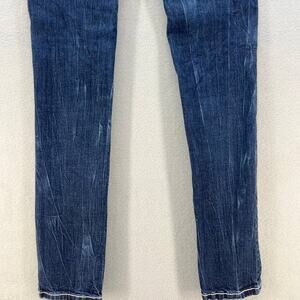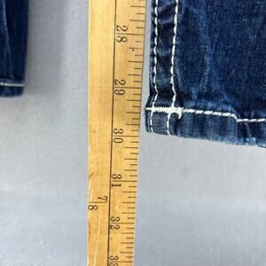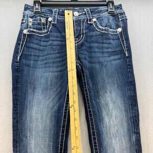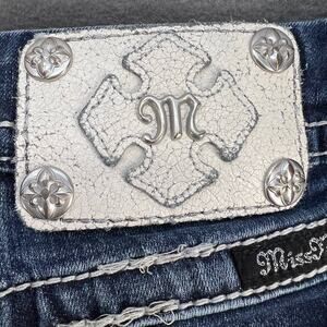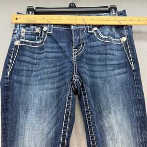Miss Me Women’s Mid Rise Skinny Jeans. Tagged size 26 (2). Blue in color with a medium denim wash. Embroidered faux button flap back pockets with an angel wings design. Added rhinestones for bling. In good preowned condition. Made of 98% cotton and 2% elastane for stretch.