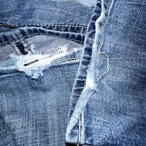 These are in great pre-owned condition. There is some fraying/tearing on the back of the pant leg at the hem. No other holes, stains, rips or tears. From a pet friendly and smoke free home.