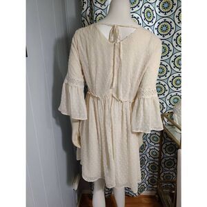 Miss Me above knee, textured, eyelet, ruffled dress. This dress is sheer, lined and has a zippered back. Pit to pit 18" waist 30" and length 34". In excellent pre-owned condition. Measurements are approximate. Bundle this dress with two other items from my closet and receive 20% off.