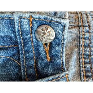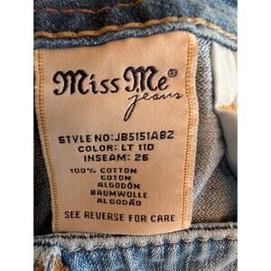 The product is a pair of Miss Me Women's Thrashed Boyfriend Blue Jeans in size 26. These jeans are made from a cotton blend denim fabric with a solid blue color. They feature a 5-pocket design, distressed detailing, and a boyfriend style. The jeans are machine washable and have a regular size type suitable for women. The brand is Miss Me, and the inseam is 27 inches. Ideal for any season, these jeans are a stylish addition to any wardrobe with their worn and distressed look.