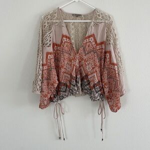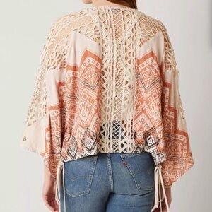 Miss Me Woven Boho Crochet Boho Cardigan ~ Crochet detail at the Selene with side tie tassels, front eye hook closure.