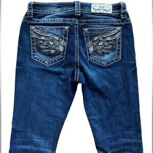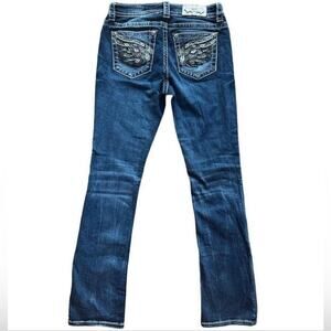 Medium dark washed Miss Me crystal Angel wing Bootcut jeans. Embellished and metallic leather detailed wings along back pockets. Item quality shown as pictured. Great condition.