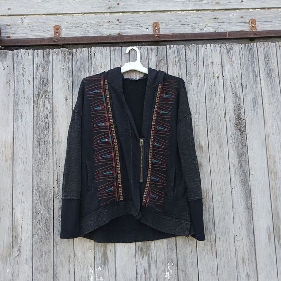 It's a black color of Zip front Embroidered Detail Sweatshirt with a hood. It has thumb holes and a raw unfinished hem. It's in good pre-owned condition Size Small
