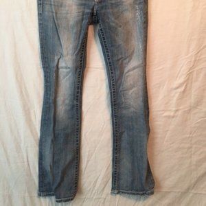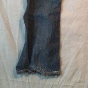 Miss Me boot-cut jeans . Fraying on and through bottom back of each leg - left worse than right. No tears, rips or stains in other areas other than original distressed markings. All leather still secure - all rhinestones present
