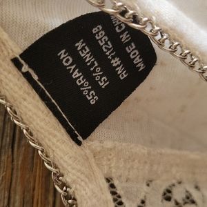 Miss Me cream LG lace sheer back top. Chain neck, sheer over top sides/back