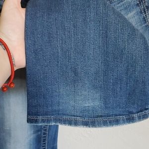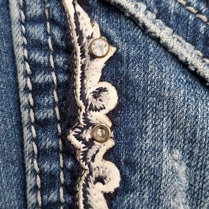 Bootcut jeans with embellished pockets. 5 pocket construction. Missing 1 rhinestone. Not noticeable.