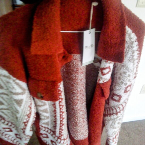 Miss Me fuzzy warm over coat . Button up" heavy but light weight. Pockets Aztec style size large.