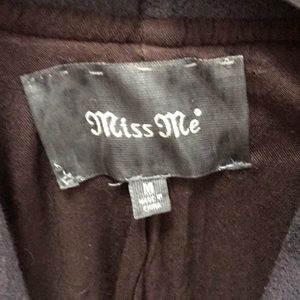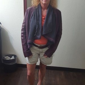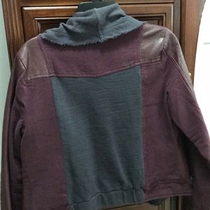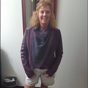 Burgundy/blue-grey material open jacket with burgundy leather on shoulders and sleeves. Has pockets and can be buttoned across! Super comfortable! Only worn a few times! Great for fall/ spring.