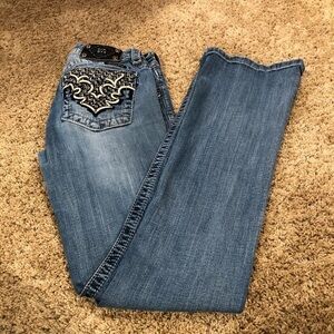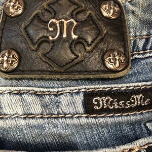 Miss Me /original /mid rise boot cut jeans /size 27 /embellished in the back some embellishments missing /big black hunk of leather with the M in the back /all other big hardware intact /does have spots of Clorox (girl doesn’t know how to do the laundry yet ) lol / it does have a hole on one of the belt hoops / can easily be fixed I don’t sew / pre-owned but still have a lot of wear! I have laundered them