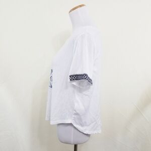 Miss Me cropped fit short sleeve t-shirt. This graphic tee features a navy blue and metallic silver boho geometric star design. White slight sheer fabric. Crew neck. High low hemline. Embroidery trim on sleeve cuffs. Size medium.