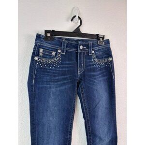 Miss Me brand women's size 27 waist boot jeans, style number JE5454B4R. In excellent pre-owned condition, only sign of wear is on the hemline distressing. Dark wash stretch jeans have stud and rhinestone details on the front and back pockets.