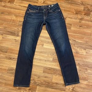 Miss Me Low Rise 5 Pocket Skinny Jeans; Miss Me 5 Pocket Low-Rise Skinny Jeans; Gray/Silver Accent Stitching, Rhinestone Details on front and back; Dark Wash Blue; JP5001S; per Miss Me jeans size guide these are a 9/10